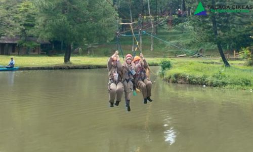 FLYING FOX – Permainan flying fox adalah wahana petualangan yang membuat seseorang meluncur dari ketinggian ke tempat yang lebih rendah menggunakan tali baja atau sling baja yang terbentang. Permainan ini bertujuan untuk melatih keberanian dan pengambilan keputusan.